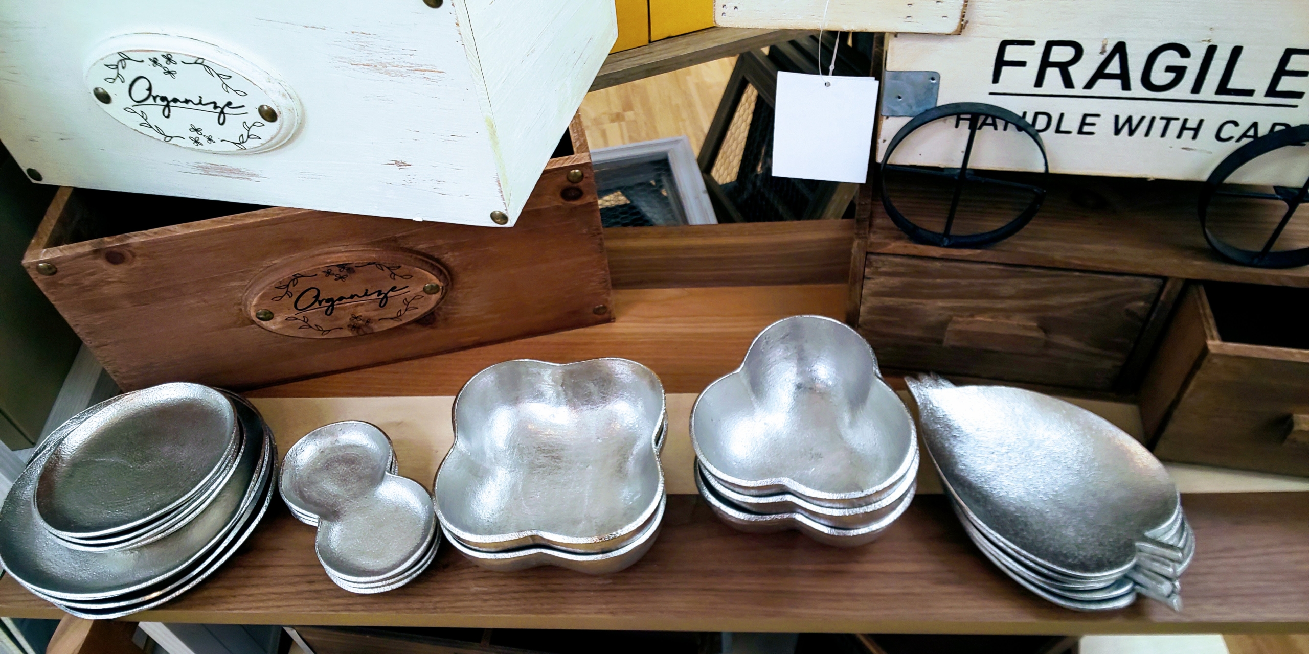 3つ目はアルミ本来のシルバーを活かしたハンドメイドのアルミトレイです。新たにリーフトレイとアルミボウルのクローバーが加わりました。クールなアルミの輝きがお気に入りのアクセサリーや小物をより引き立ててくれます。毎日つけるアクセサリー置き場やペンなどを置くデスクトレイとして、ちょっとしたギフトにオススメです。