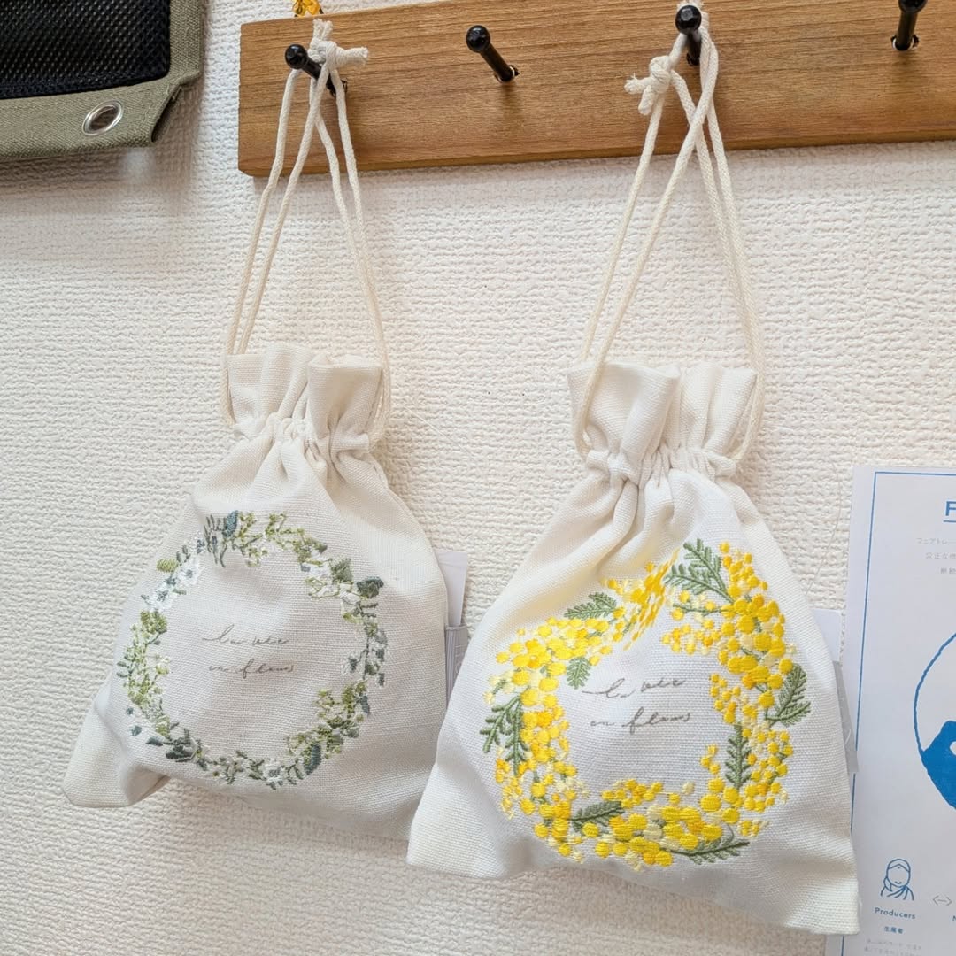 巾着袋はミモザ、グリーンリース、押し花、デイジー、ハーブの5種類になります