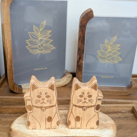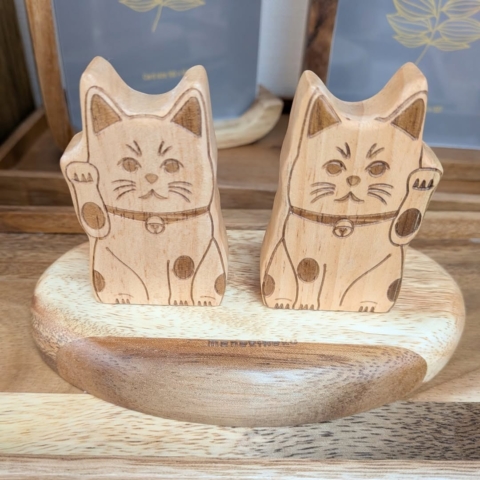 そして次に木目があまり目立たない木、ラバーウッドを使用したまねきねこのオブジェです