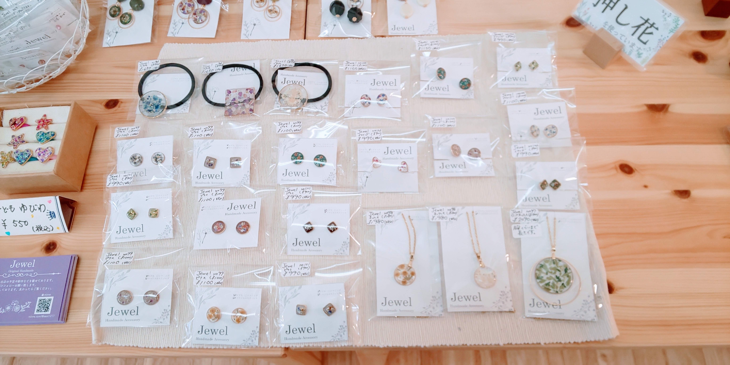 「Jewel」さんはレジンに押し花を入れて一点物のアクセサリーを製作している作家さんです!!ピアス・イヤリング・ネックレス・ヘアゴム等どれも一点物です。自分のお気に入りをぜひ見つけていただき身に着けた瞬間、可憐な押し花たちが光り輝き、あなたにとって素敵な1日になればとても嬉しいです(^_^)